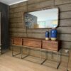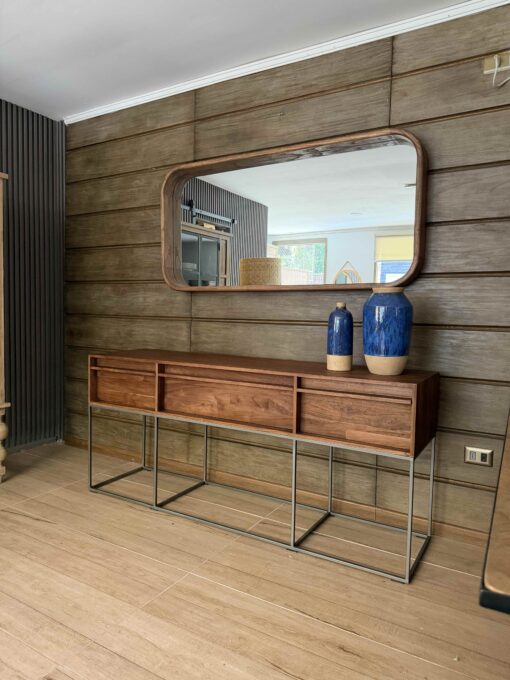 Precioso y moderno arrimo fabricado en estructura de fierro negro y madera de teca natural.