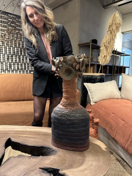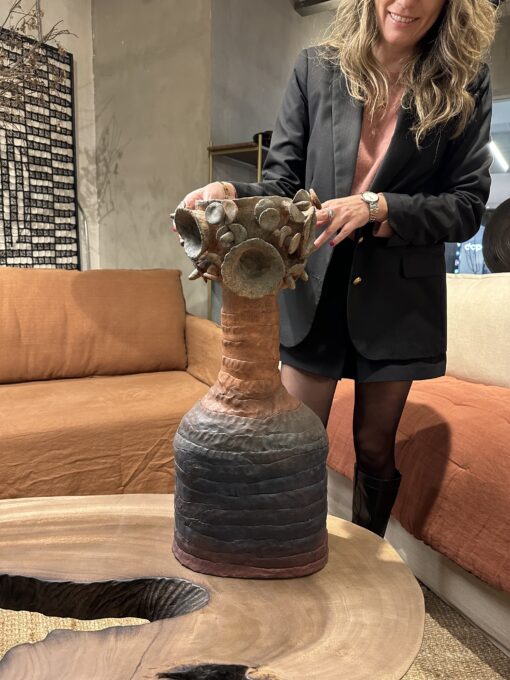 Escultura realizada en cerámica gres, inspirada en elementos naturales, sus líneas ondulantes y asimétricas se entrelazan y fluyen con suavidad, sin ángulos rectos ni cortes.