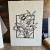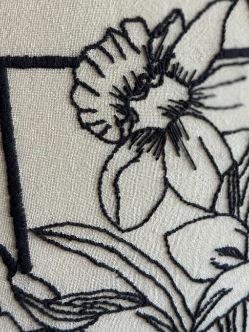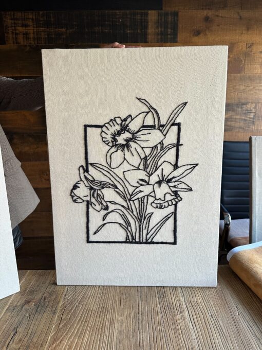 Este cuadro de decoración bordado a mano presenta flores de narcisos en líneas negras sobre fondo blanco, enmarcadas en un recuadro simple que resalta su diseño delicado y elegante.