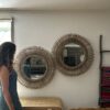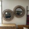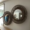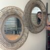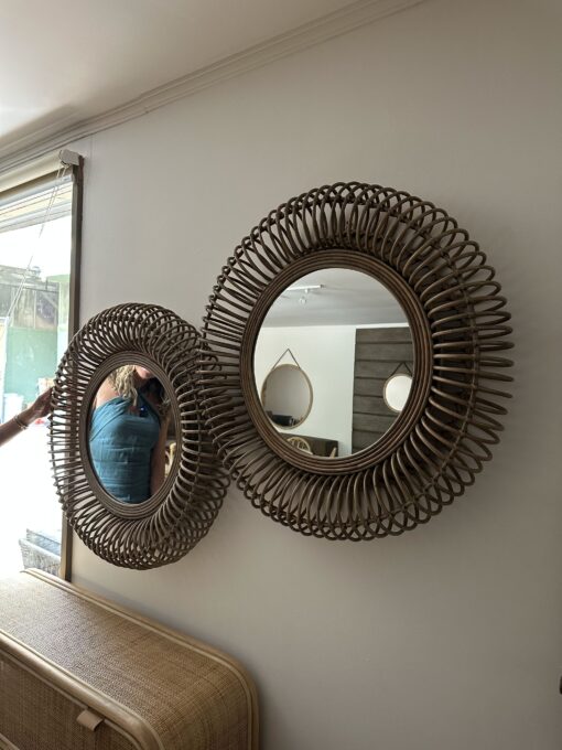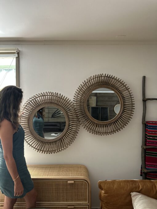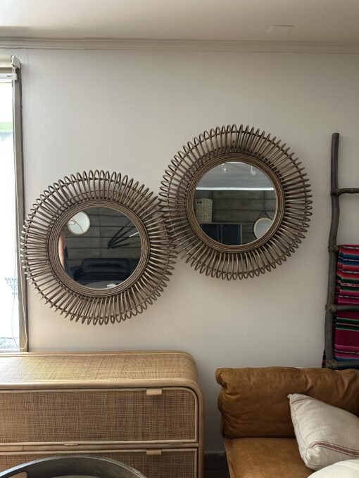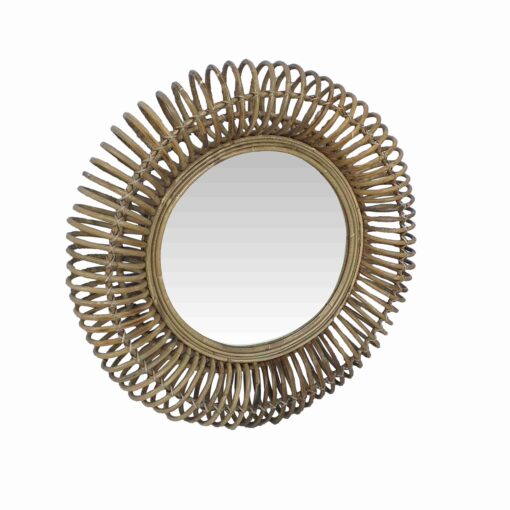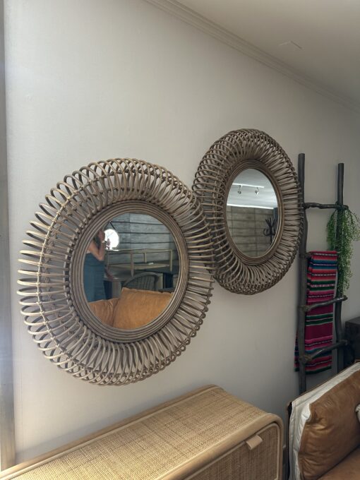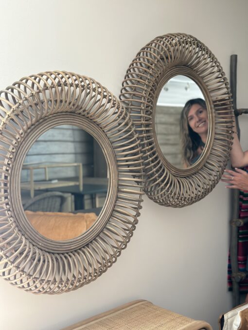 Decorativo espejo fabricado en rattan natural con terminacion de pintura en color gris vintage.