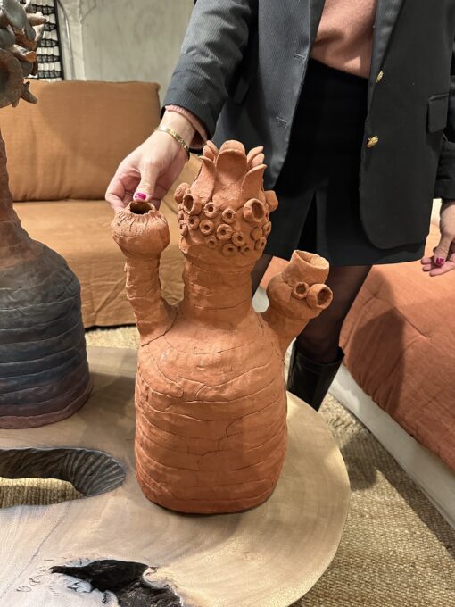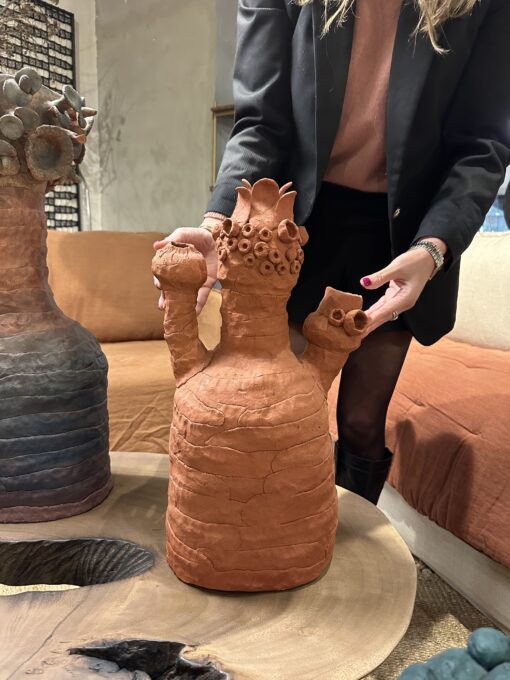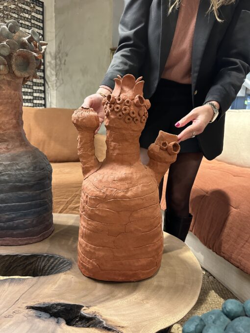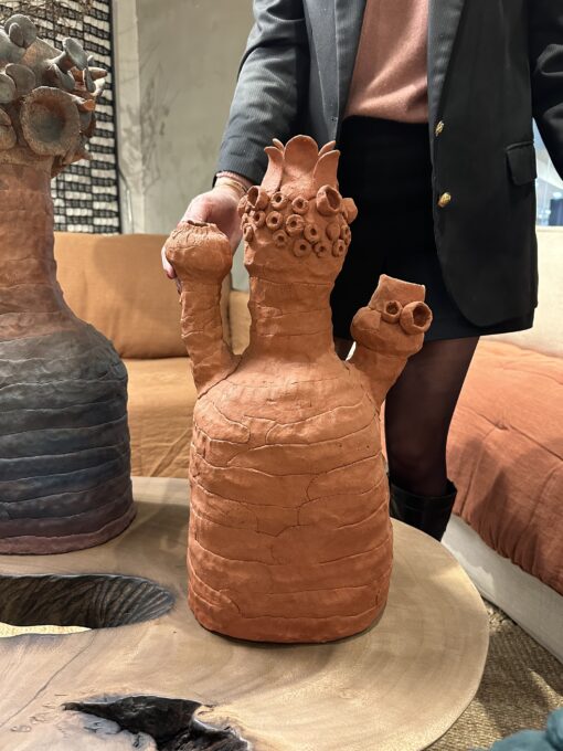 Escultura realizada en cerámica gres, inspirada en elementos naturales, sus líneas ondulantes y asimétricas se entrelazan y fluyen con suavidad, sin ángulos rectos ni cortes.
