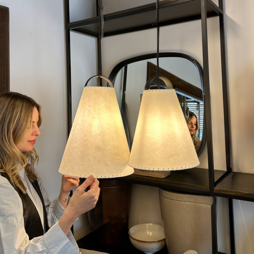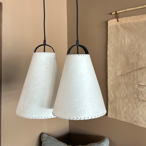 Elaborada en pergamino natural (cuero curtido), esta pieza encarna la estética wabi sabi, donde la belleza está en lo simple, lo imperfecto y el paso del tiempo. Su acabado revela la huella del trabajo artesanal, haciendo cada lámpara especial.