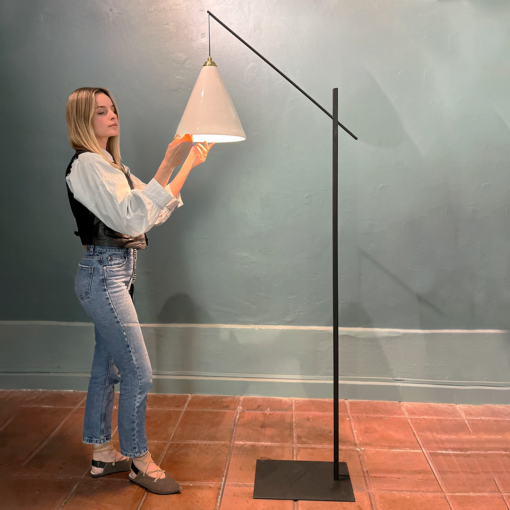 Linda y estilizada lámpara de pie con pedestal de fierro y pantalla de cerámica y detalle en bronce.🖤