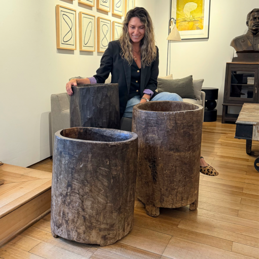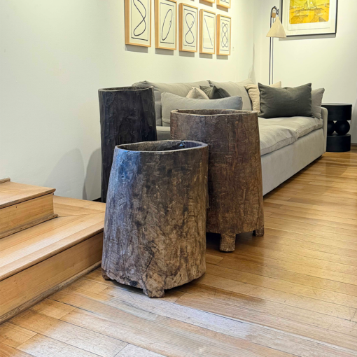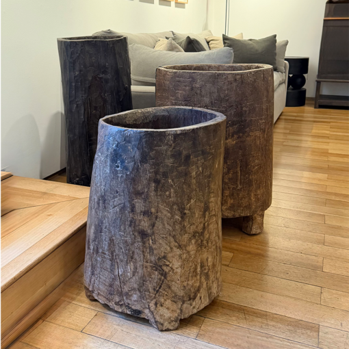Estos recipientes de madera de teca, tallados a mano en un solo bloque, traen consigo una belleza imperfecta que solo el tiempo puede crear. Cada marca y veta cuenta una historia, transformándose en piezas únicas que llenan de calidez cualquier espacio.