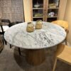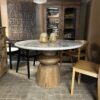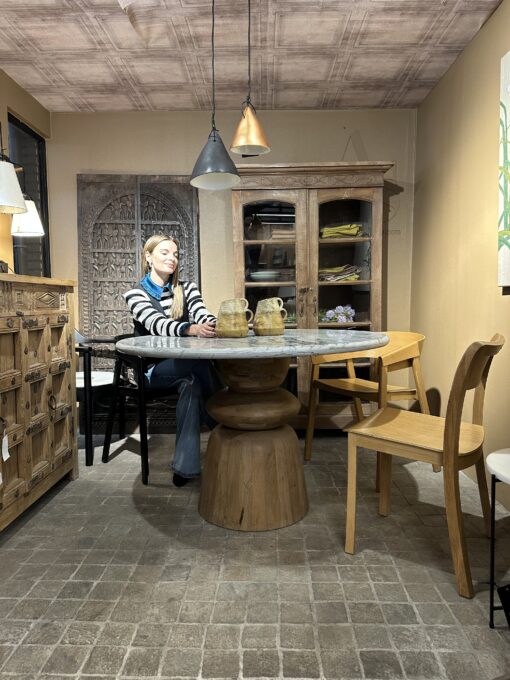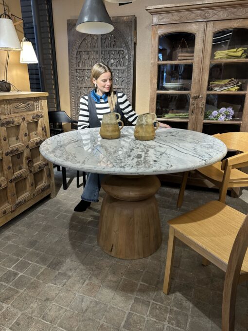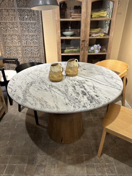 Combina dos materiales de alta gama para crear una pieza de diseño única: una base sólida de madera de mango maciza, conocida por su resistencia estructural y belleza orgánica, y una cubierta de mármol en tono café grisáceos, que aporta una presencia elegante y atemporal. Cada mesa es única gracias a las variaciones naturales del mármol y la madera, lo que garantiza exclusividad en cada pieza.