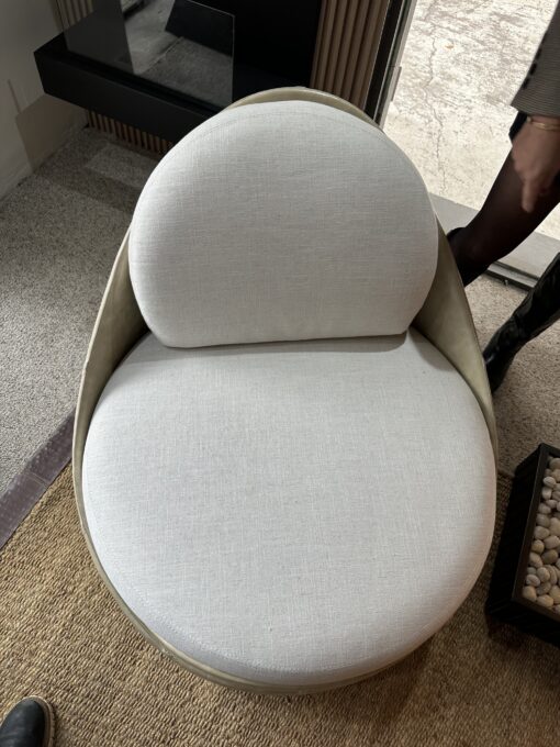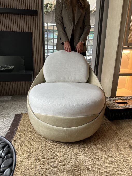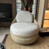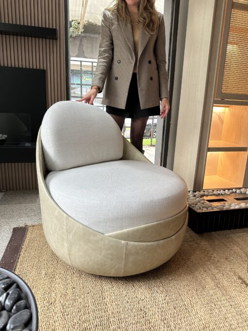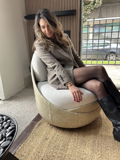 Sillón giratorio de diseño envolvente, con forma curva, que gira en 360° para acompañar el movimiento de manera sutil y cómoda.