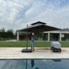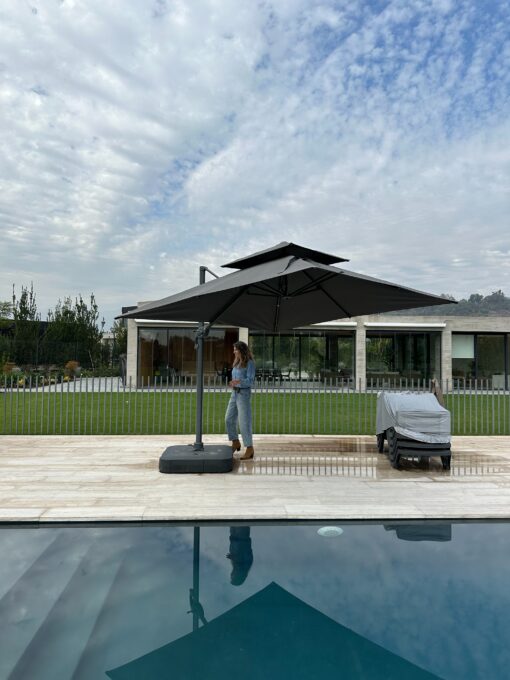Moderno y práctico quitasol de brazo lateral fabricado en estructura de aluminio, con tratamiento de pintura para exterior y tela de fibra poliéster, de 250grs, impermeable y gran resistencia al sol. La tela cuenta con un recubrimiento de protección UV contra los rayos del sol, para que evite decoloración. Su base tiene un peso de 150 kg, por lo que soporta de muy buena forma vientos. Gira en 360 grados con pedal de pie para cubrir de mejor forma el sol y su movimiento. Cuenta con 6 posiciones.