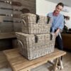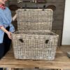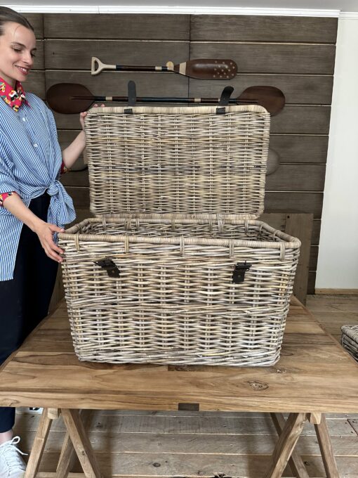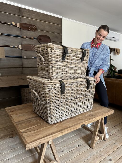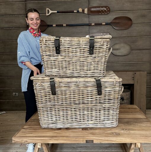 Precioso y funcional set de dos baúles fabricados en firme rattan Kubu, color natural. Cuentan con tapa, con cierre tipo cinturón y tiradores en ambos lados.