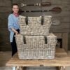 Gran set de tres canastos fabricados en rattan Kubu grueso y firme, cuentan con pintura negro gloss. Vienen con dos tiradores de rattan trenzado. Son muy decorativos y versátiles, para usar en interior o exterior, como decoración o porta maceteros.