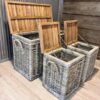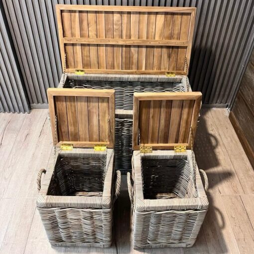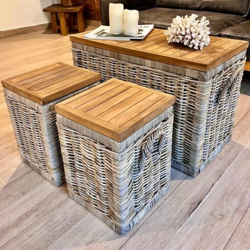 Decorativo y funcional set de mesas de centro y laterales, fabricados en rattan natural con terminacion de pintura en color gris vintage, con cubierta de madera de teca. Todas las mesas se abren como baúles.