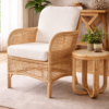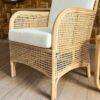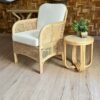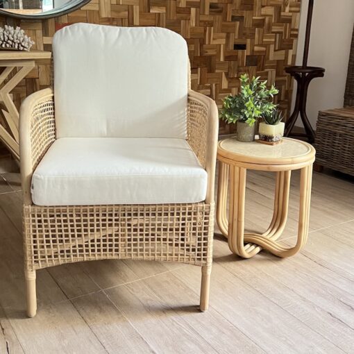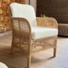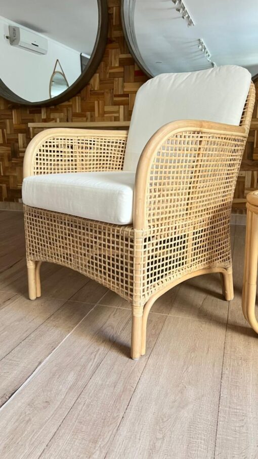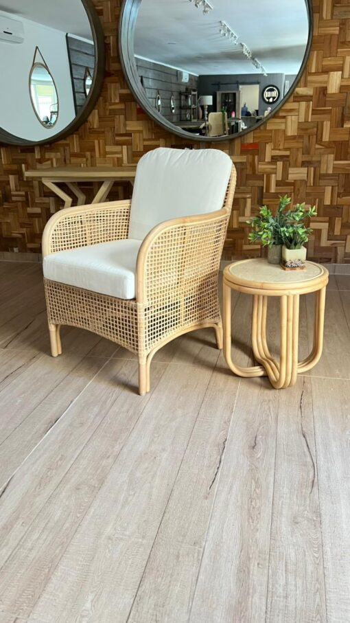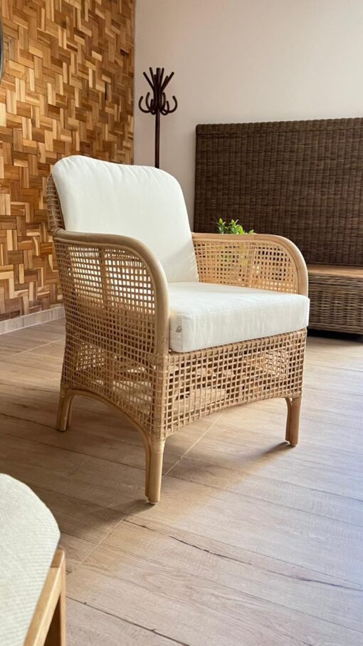 Fabricado en rattan natural, el Sitial Caimán destaca por su textura orgánica y su estilo relajado. Incluye cojín blanco en asiento y respaldo, aportando comodidad y un contraste limpio que ilumina cualquier espacio.