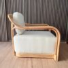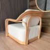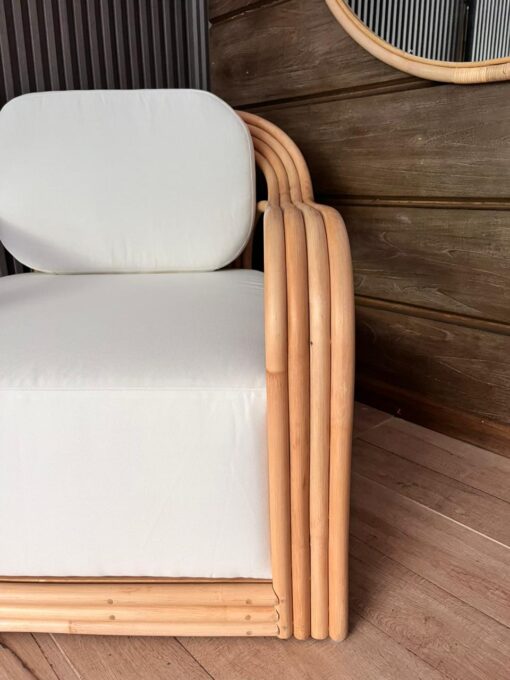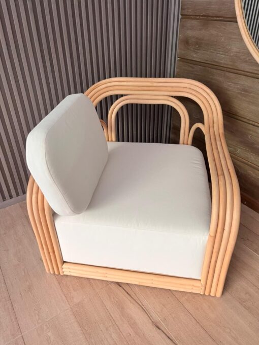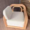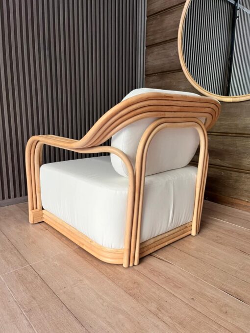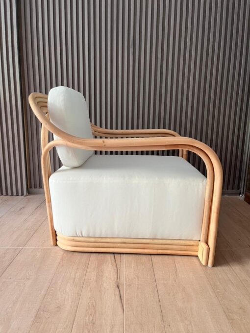 Fabricado en rattan natural, el Sitial Perú destaca por su estructura envolvente y proporciones amplias que invitan al descanso. Incluye cojín blanco en asiento y respaldo, aportando comodidad y un contraste luminoso que realza su materialidad.