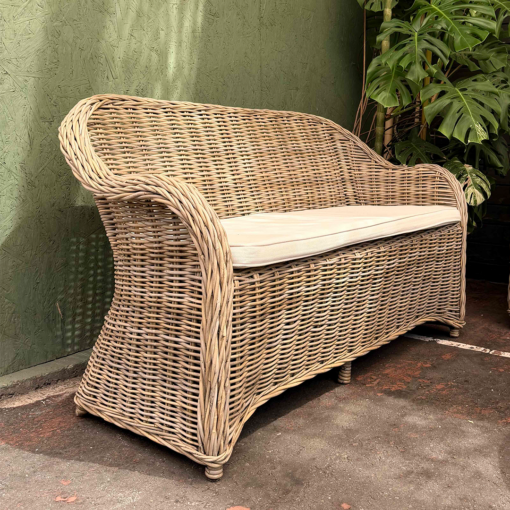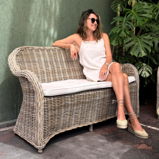 Espectacular y decorativo sofa doble fabricado en rattan natural. Incluye cojin en asiento de color blanco