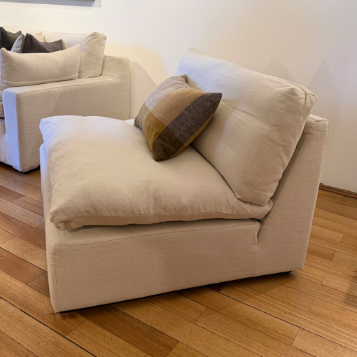 Tapizado en lino con algodón, una tela suave, resistente y que no se arruga, ideal para el uso diario. Sus fundas desmontables permiten un fácil mantenimiento, mientras que el relleno de plumas y espuma de alta densidad entrega una comodidad envolvente.